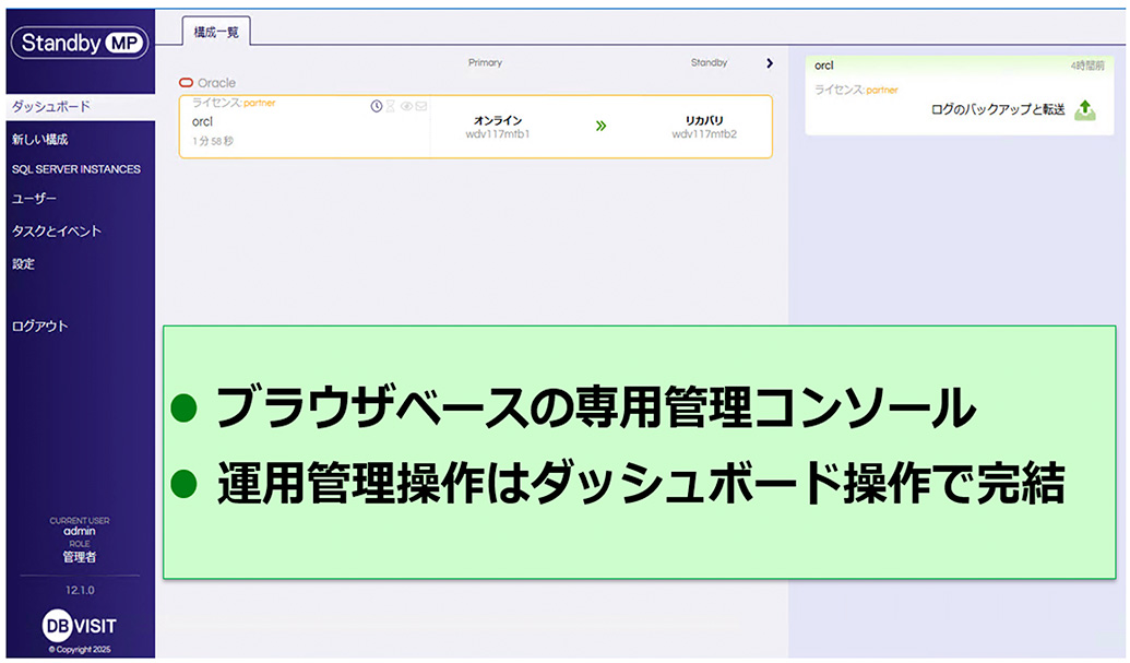 Dbvisit Standbyは、Oracle Database SE(SE1、SE、SE2)、SQL Server(Standard、WEB、Personal、Express)、PostgreSQLの為に作られた、DR(ディザスタリカバリ/災害対策)環境構築・管理ソリューションです。
